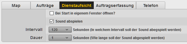 Der Intervall bestimmt die Abstände zwischen den Signalisierungen solange ein Auftrag in der Dienstaufsicht steht. Die Dauer bestimmt wie oft der Warnton abgespielt wird. Bei der Einstellung 120 / 5 wird der Warnton alle 2 Minuten abgespielt mit je einer Signalisierung von 5 Tönen.
